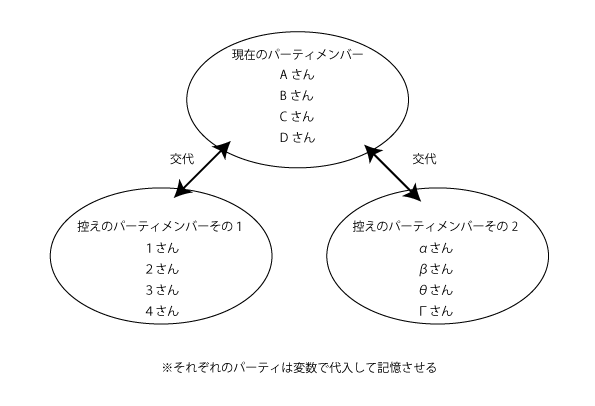 変数[10]から[13]までの値を取得して、パーティを再編成するスクリプトのサンプルです。