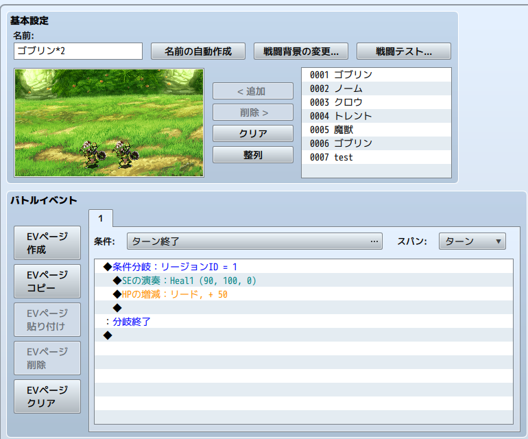 また、スパンをバトルにすると戦闘中に1度しか発動しなくなるので1度イベントが実行されると2回目以降はイベントは実行されません。