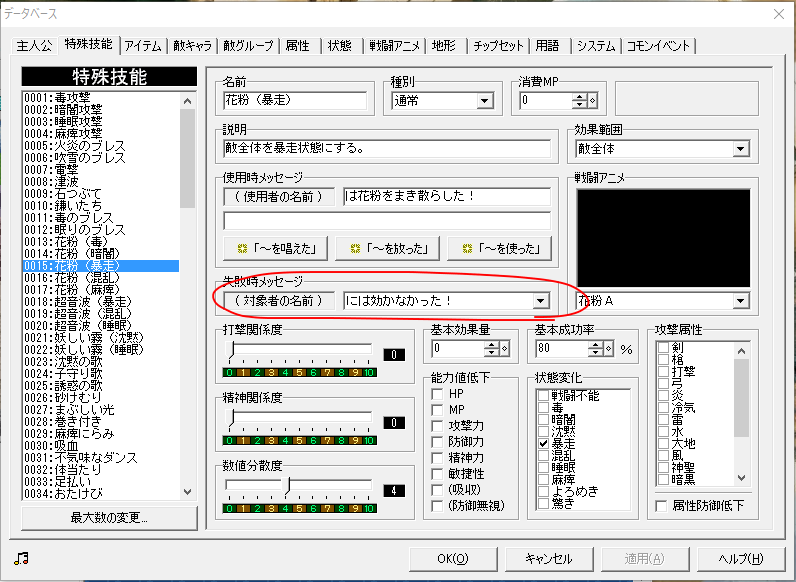 RPGツクール2000に特殊技能、MVで言うところのスキルにおいて、失敗時に表示するメッセージをそのスキルごとに設定する欄があったのですが、MVでは無くなっていました。